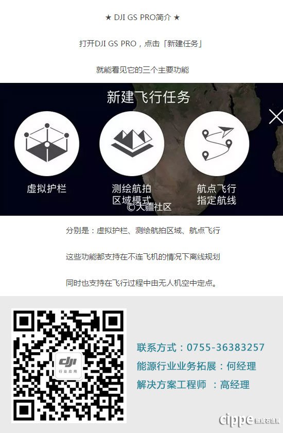 DJI GS Pro(Ground Station Pro)是一款可控制DJI飞行器实现自主航线规划及飞行的iPad应用程序。GS Pro拥有直观简易的交互设计,只需轻点屏幕,就能轻松规划复杂航线任务。通过使用GS Pro,可大幅提升建筑行业、精准农业、空中摄影测量、电力巡检、石油管道巡检、安全监控和灾害救援等领域的任务执行效率。在管道巡检中利用GS PRO可以设置飞行器的飞行路线,可用于输油管道固定点,固定线路或固定区域巡航。